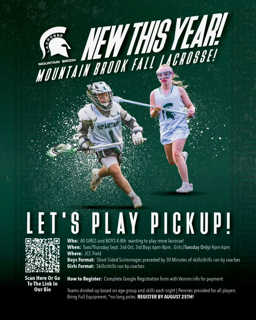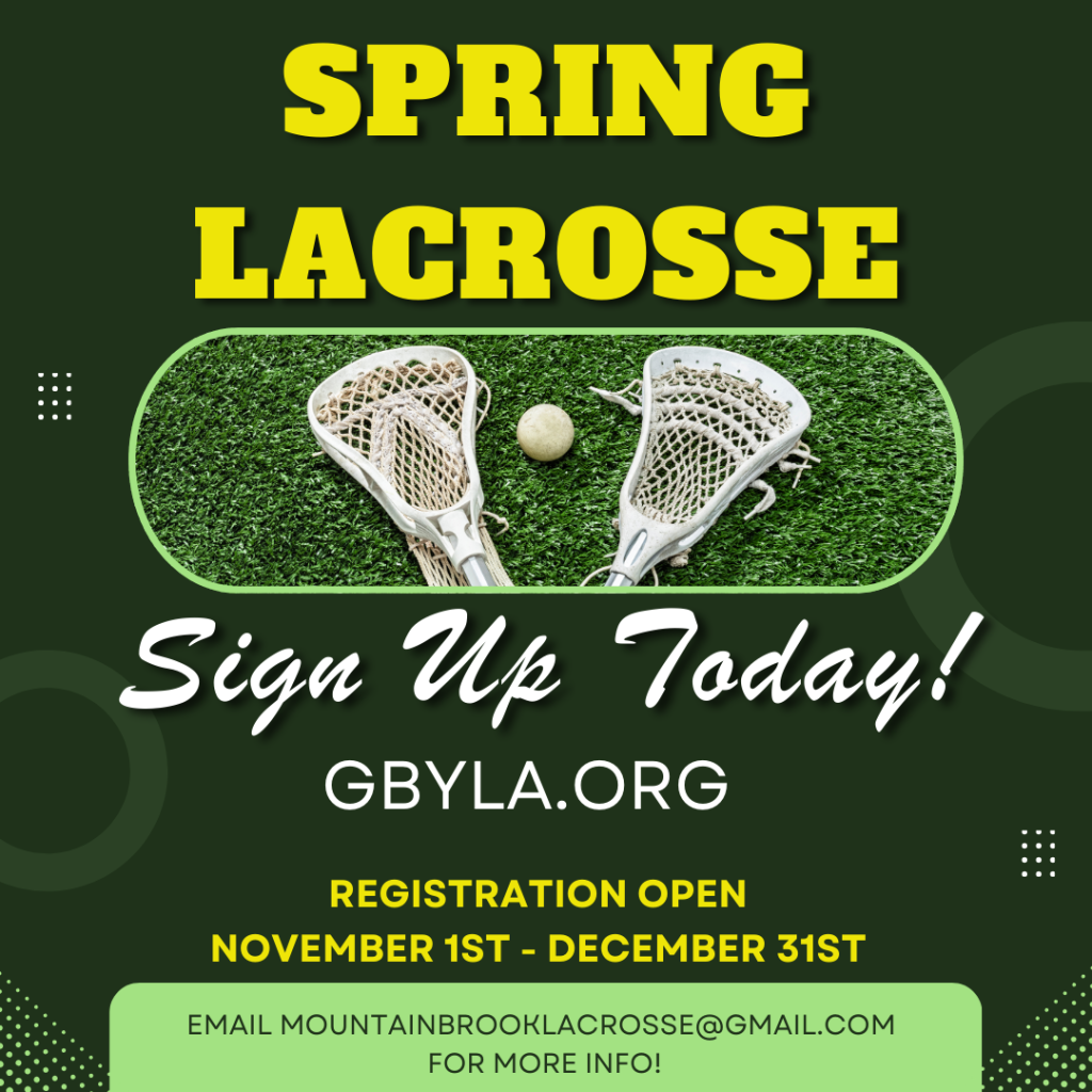 Sign up starts November 1st for Spring 2025 Lacrosse. Don’t miss out this year on all the fun! Go to https://gbyla.org/spring-season/ for registration details. Email us at MountainBrookLacrosse.com for more information!